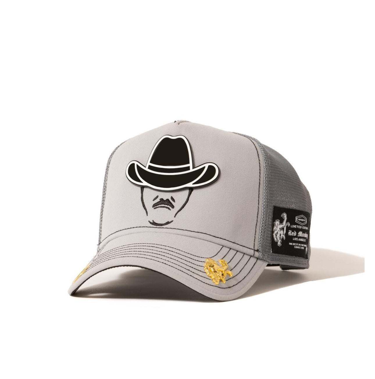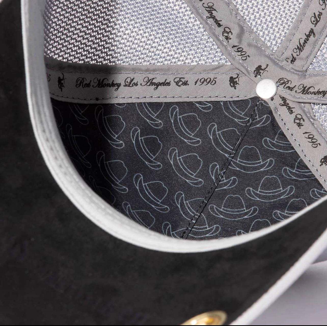 Rich Lt. Grey fabric serves as the canvas for this unique design. Large 3-D Sombrero mold In Black with White accents. Contrast Black embroidery completes the design along with an exclusive, unique satin lining on the inside.