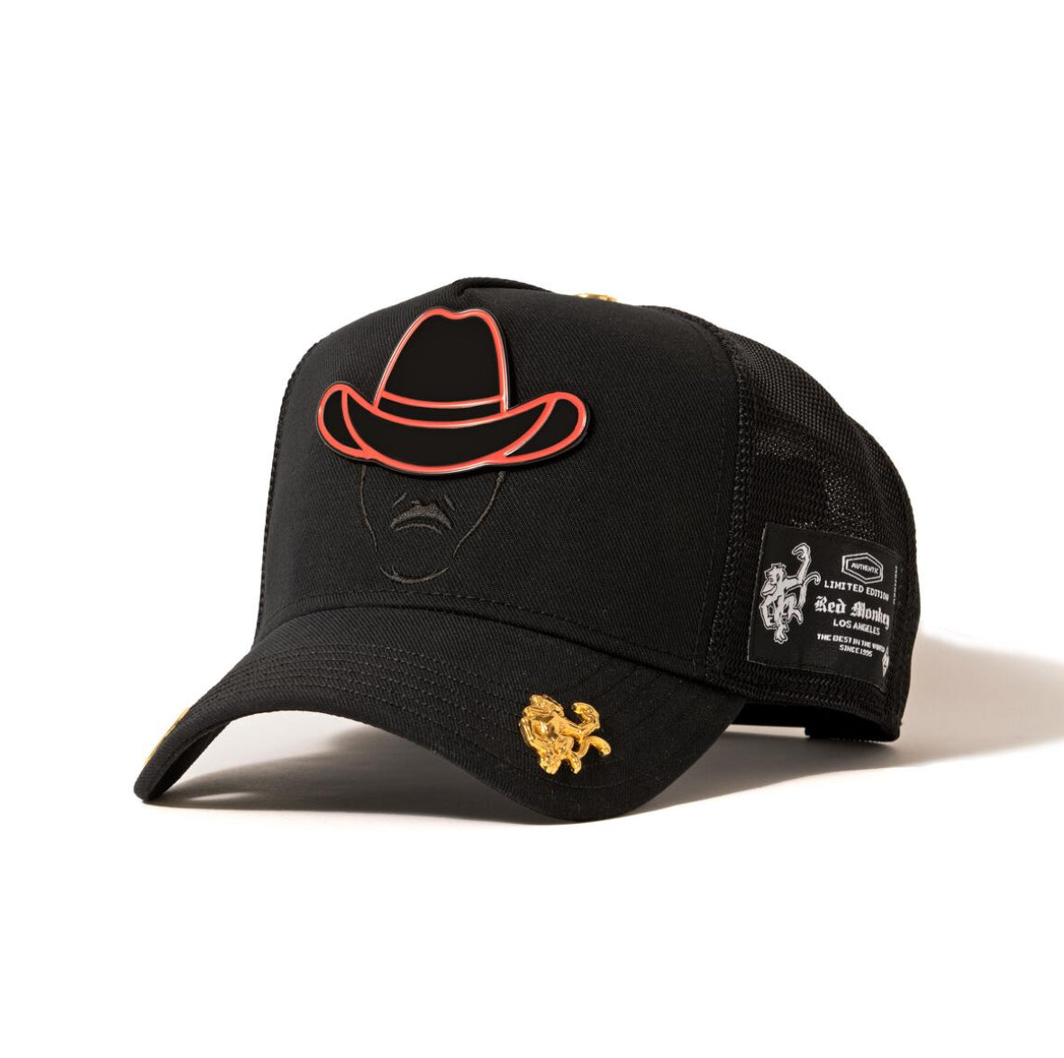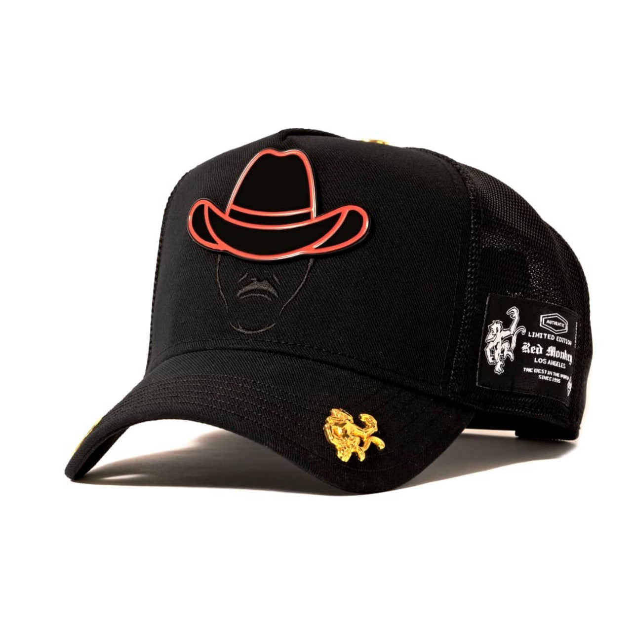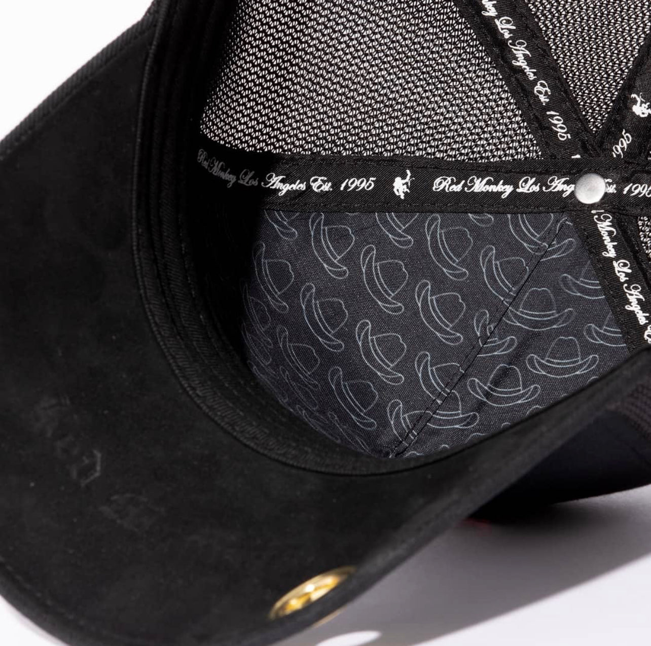 Rich Black fabric serves as the canvas for this unique design. Large 3-D Sombrero mold In Black with Red accents. Tonal embroidery completes the design along with an exclusive, unique satin lining on the inside.