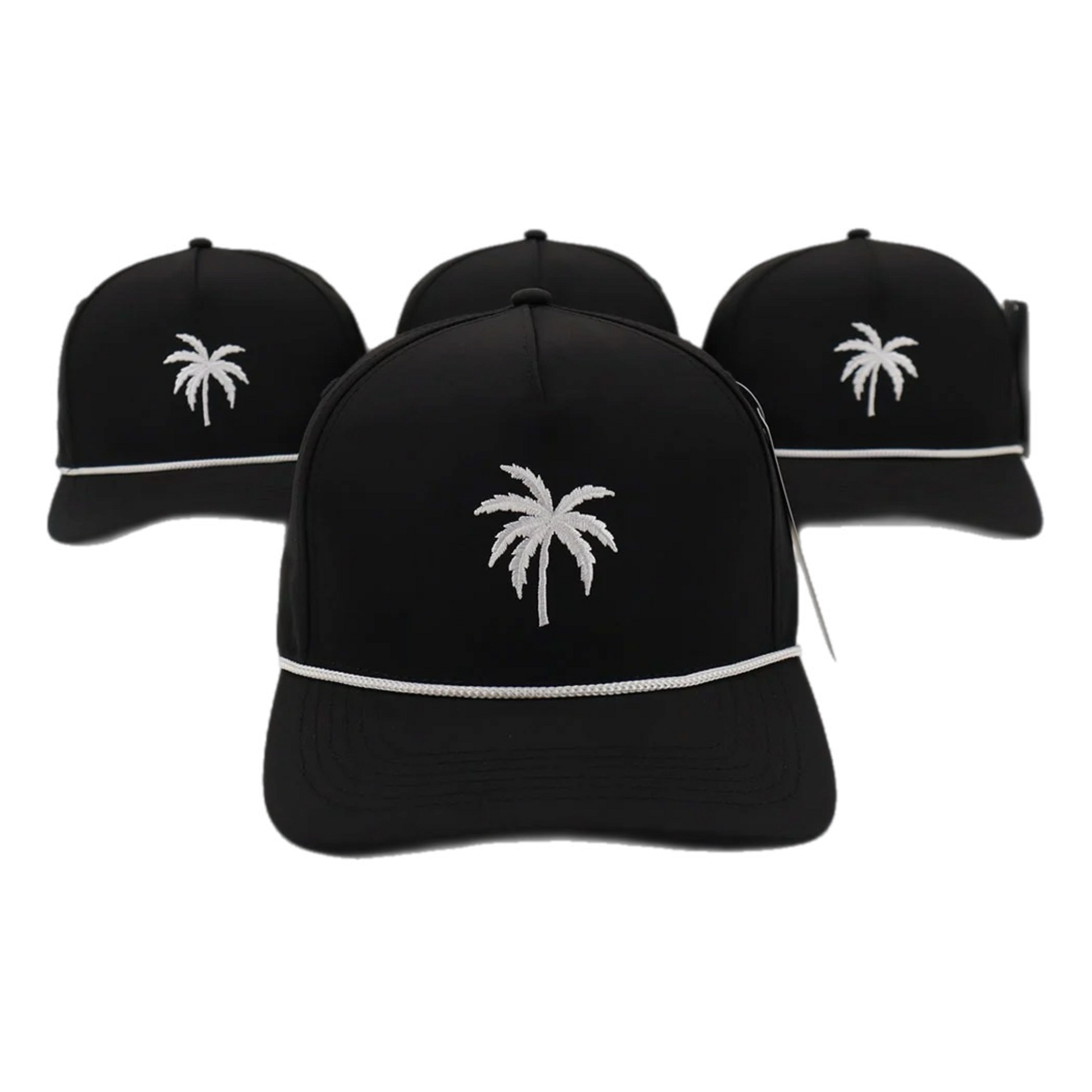 Introducing Palmera Black, the ultimate waterproof drifit hat. Featuring a sleek white embroidered palm tree and a stylish white rope on the visor. With a convenient snapback design, this one size fits most hat is perfect for any adventure. Stay protected and stylish with Palmera Black.