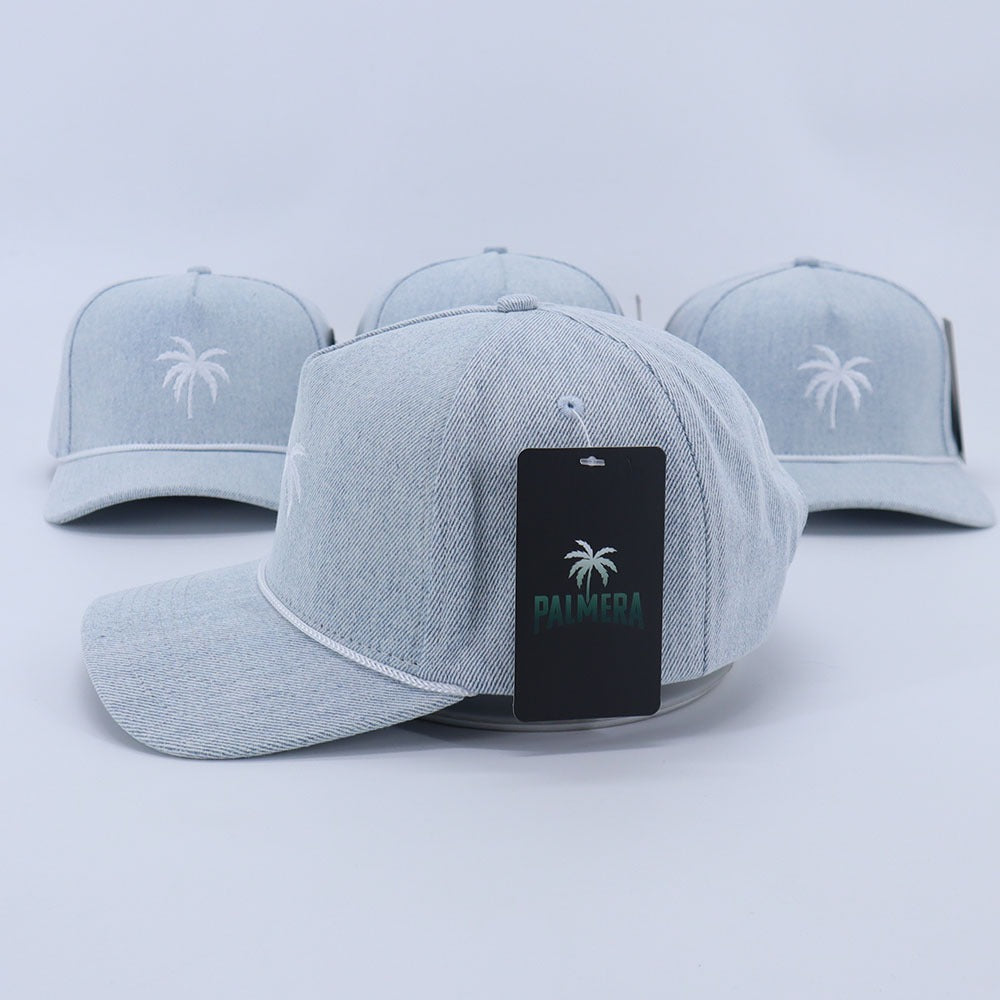 Introducing Palmera Denim, the ultimate waterproof drifit hat. Featuring a sleek white embroidered palm tree and a stylish white rope on the visor. With a convenient snapback design, this one size fits most hat is perfect for any adventure. Stay protected and stylish with Palmera Denim. #GDCERTIFIED