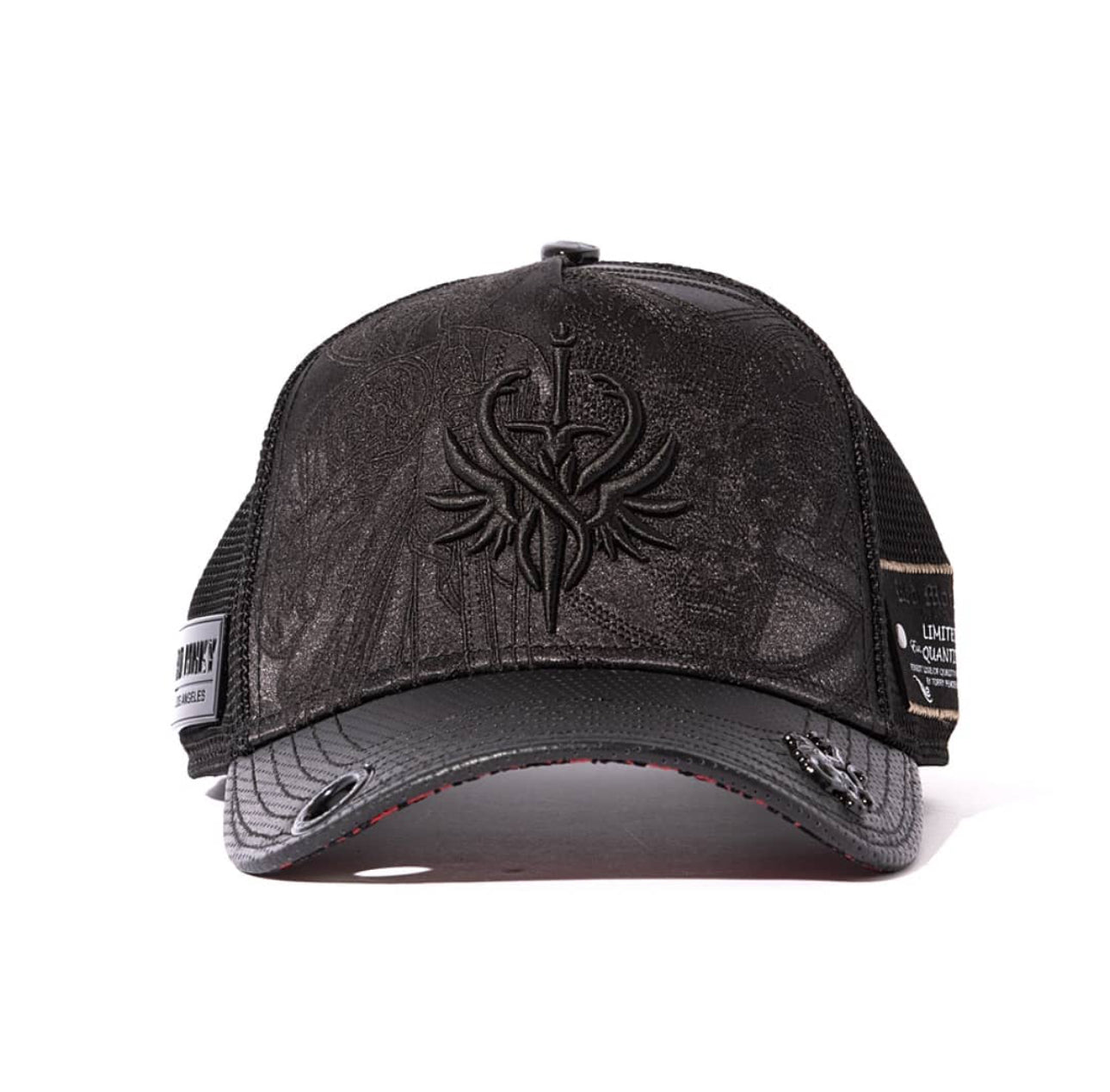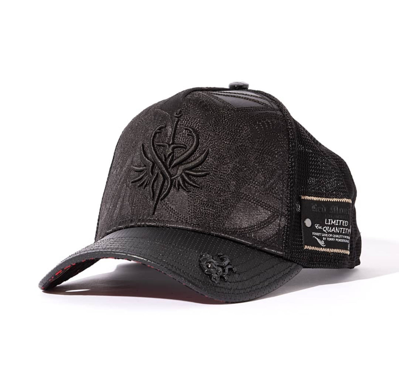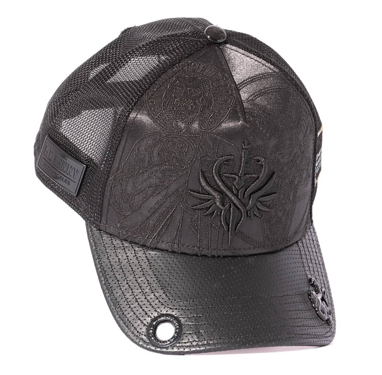 Black satin crown showcases tonal embroidery and a 3D emblem. Perforated leather visor and black plated hardware.