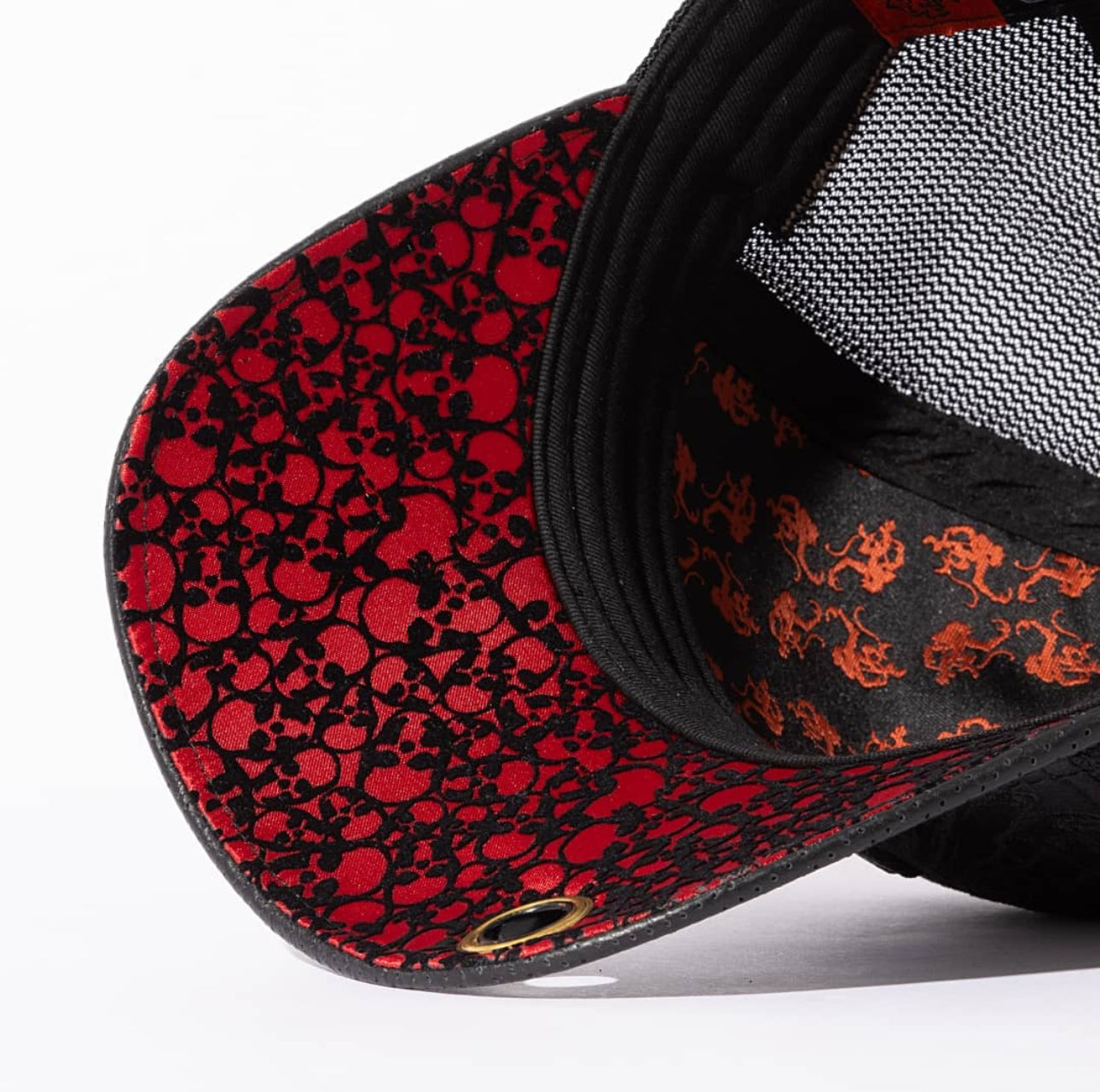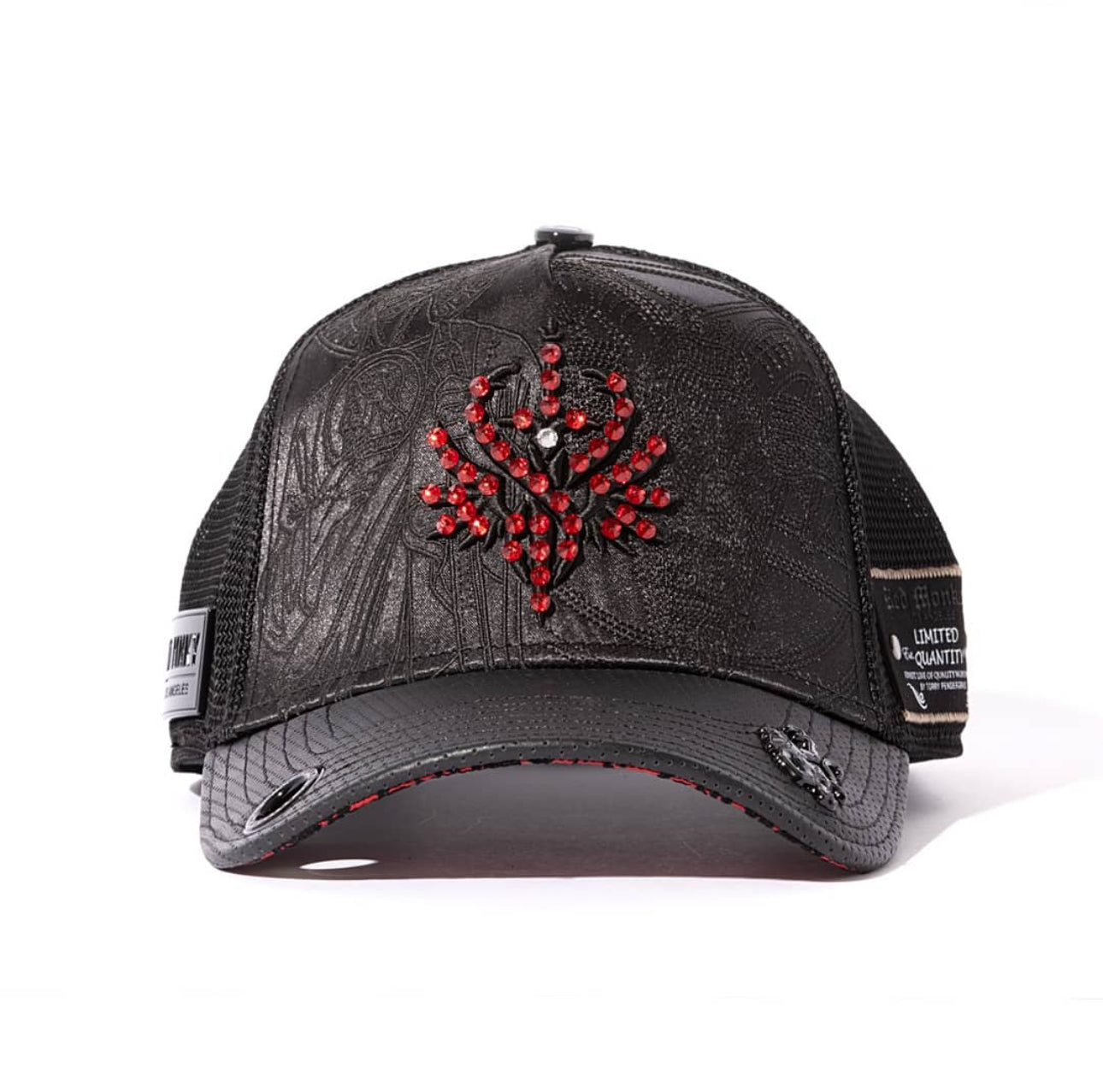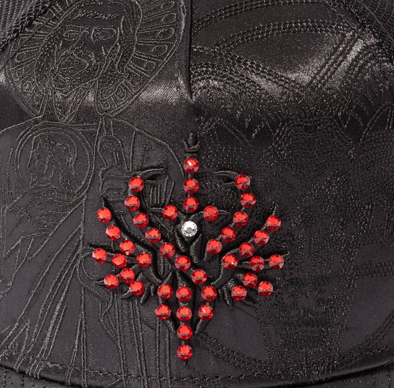 Black satin crown showcases tonal embroidery and a 3D emblem. Perforated leather visor and black plated hardware.