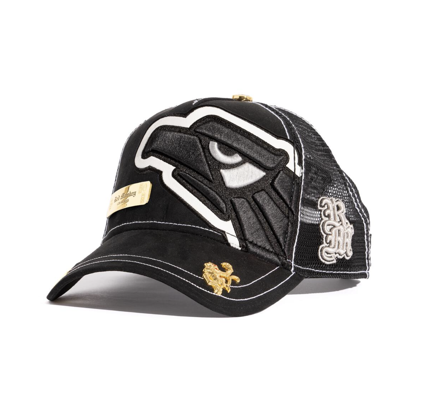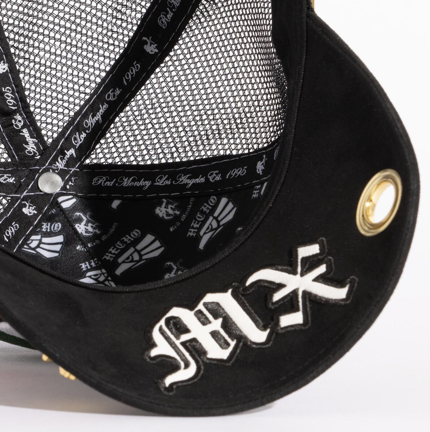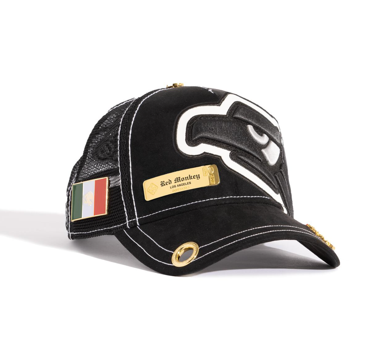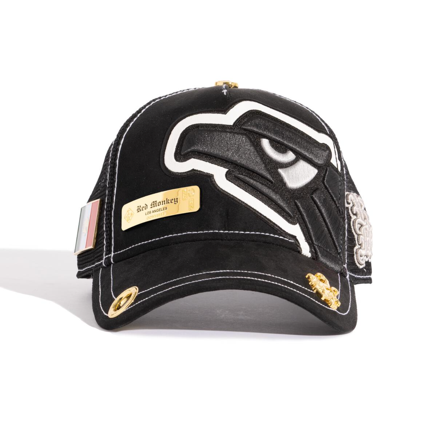Micro suede trucker in deep, rich Black. Tonal 3-D embroidered front graphic with a tumbled leather outline in White. 18K gold-plated mold on front panel and a Mexico flag on the right side.