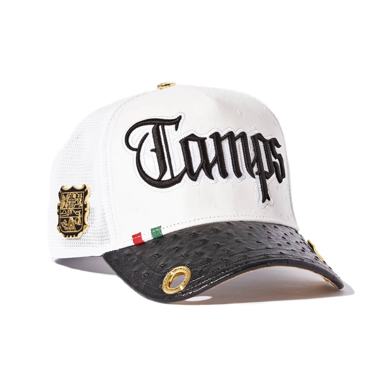 Red Monkey Tamps '24 is an epic edition of the celebration of Tamaulipas series. Ostrich textured crown & visor showcases 3D Tamps embroidery. A custom 18k gold plated visor clip pops on the visor. The state of Tamaulipas 18k gold plated emblem is on the left side. A custom woven patch is on the right side. The finishing touches on the inside are the printed crown lining and a beautiful tan suede under visor and rubberized mark.