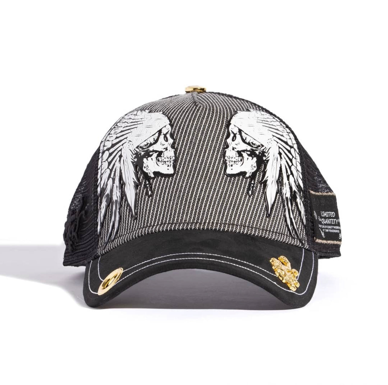 Red Monkey Chief is a unique blend of mixed media featuring a herringbone base fabric embellished with 2 rubberized molds mixed with a suede visor. 18k gold plated hardware.